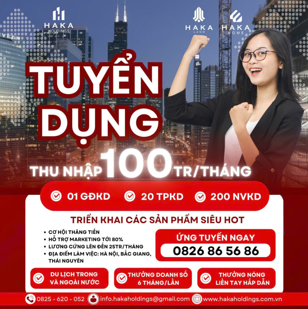 Nhằm mở rộng quy mô hoạt động và chuẩn bị nguồn lực cho hàng loạt dự án bất động sản sắp triển khai, Haka Holdings chính thức tuyển dụng số lượng lớn các vị trí kinh doanh tại Hà Nội, Bắc Giang và Thái Nguyên. Đây là cơ hội hấp dẫn cho những ứng viên có năng lực, tinh thần cầu tiến và mong muốn phát triển sự nghiệp trong lĩnh vực bất động sản.